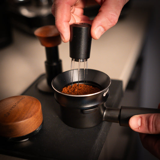 A gravity distributor tool takes the guesswork out of puck prep, auto-adjusting to your dose for smoother, more consistent espresso shots every time