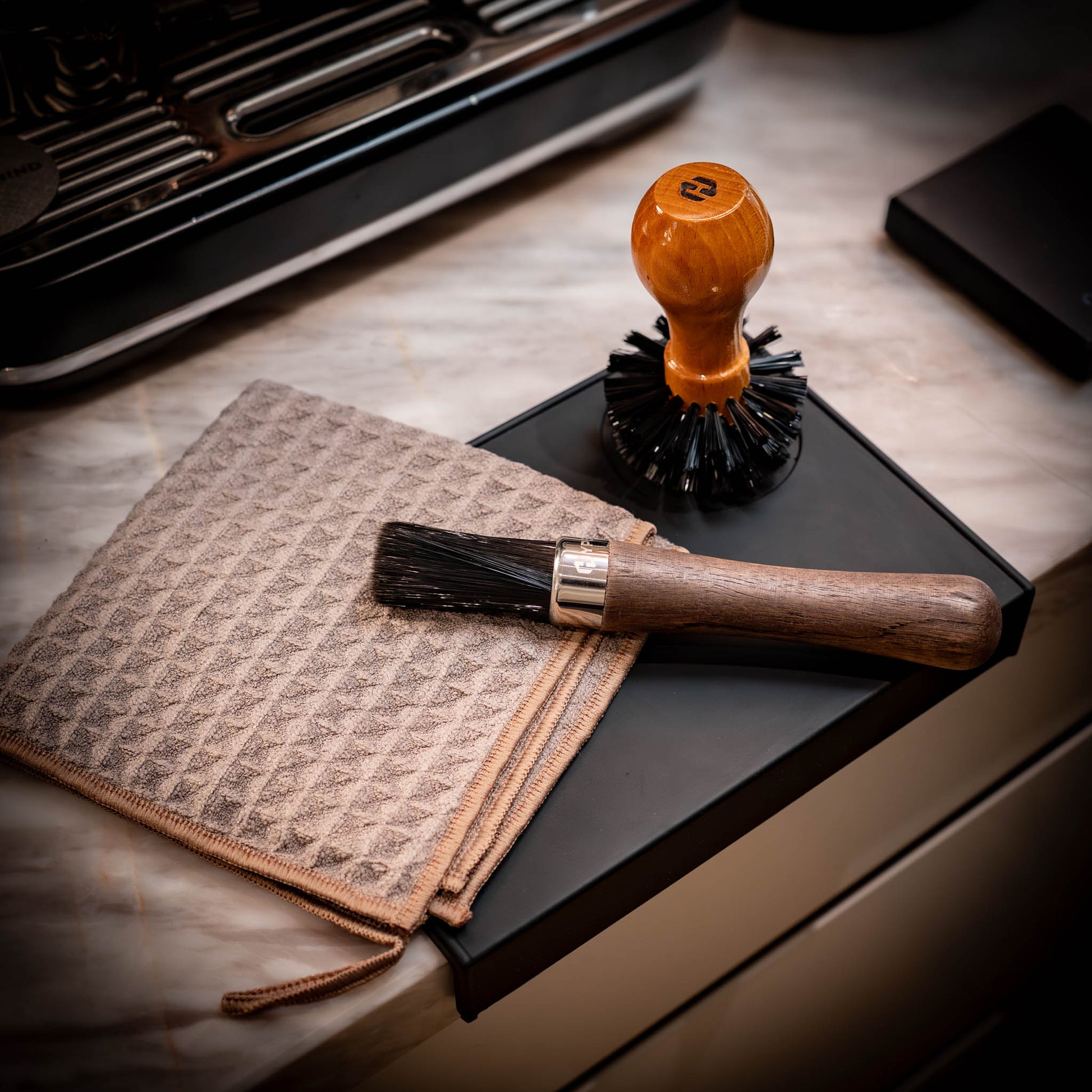 Keep your home espresso area spotless and running smoothly with the Hypergrind Cleaning & Maintenance Kit — a carefully curated four-piece set designed to make daily upkeep simple, efficient, and enjoyable. This collection pairs our Silicone Tamping Mat, Portafilter Cleaning Brush, Walnut Grinder Brush, and Microfibre Coffee Towel, giving you everything you need to maintain a tidy, café-worthy workflow.