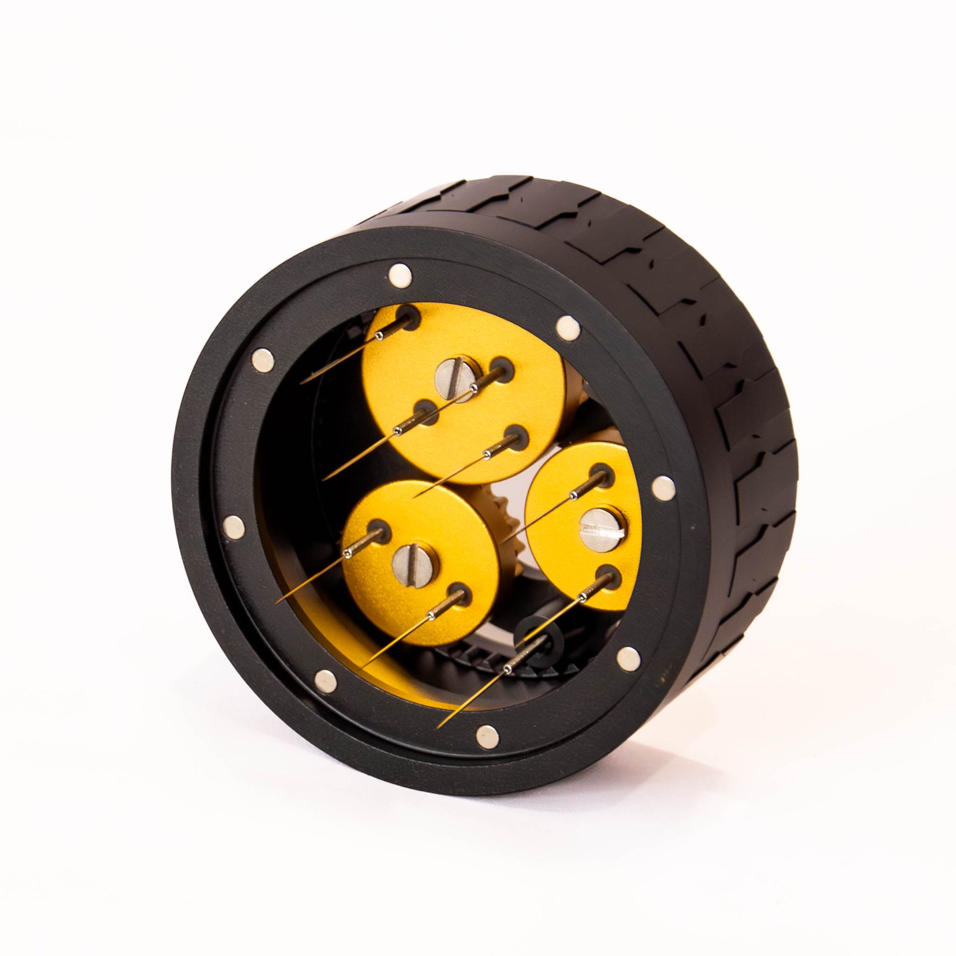 Three golden cogs rotate independently to drive nine ultra-fine 316 stainless steel needles in precise, spirographic patterns. The result is perfectly even distribution, every time.